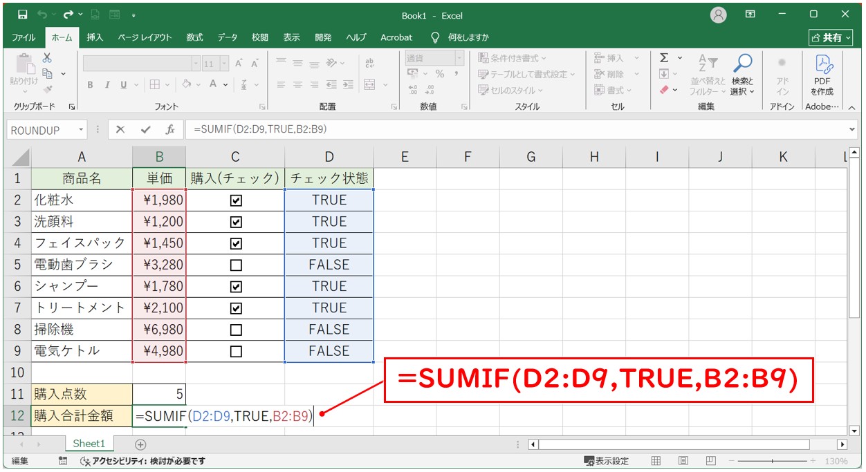 これで、チェックが付いた「TRUE」と同じ行にある単価だけを足して、購入点数分の金額を合計することができました。