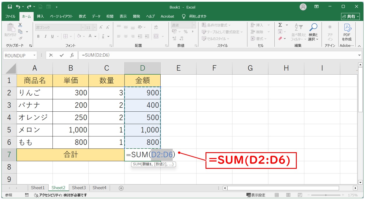 次に、各商品の「単価×数量」の金額をSUM関数を使って合計し、合計金額を求めます。