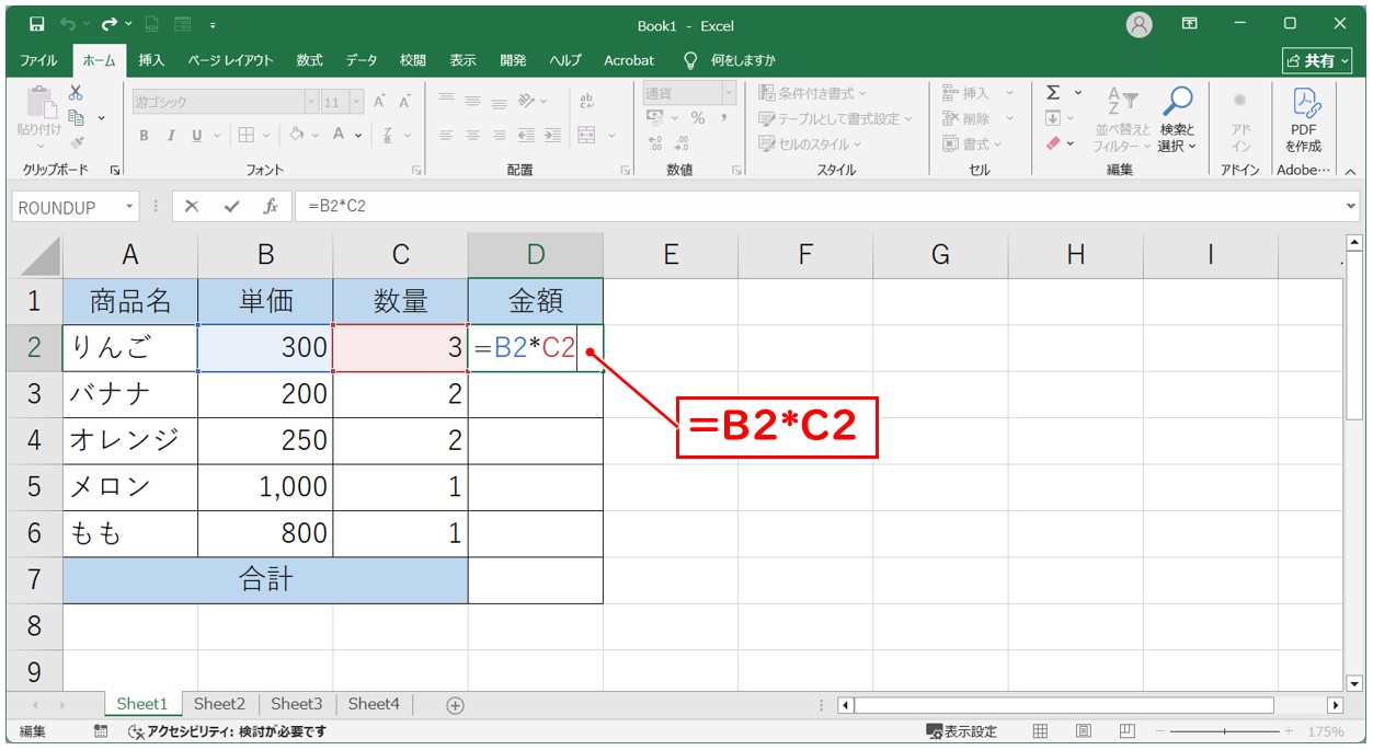 まず、セル【D2】に半角入力で「=B2*C2」となるように入力し、「Enter」を押して確定します。